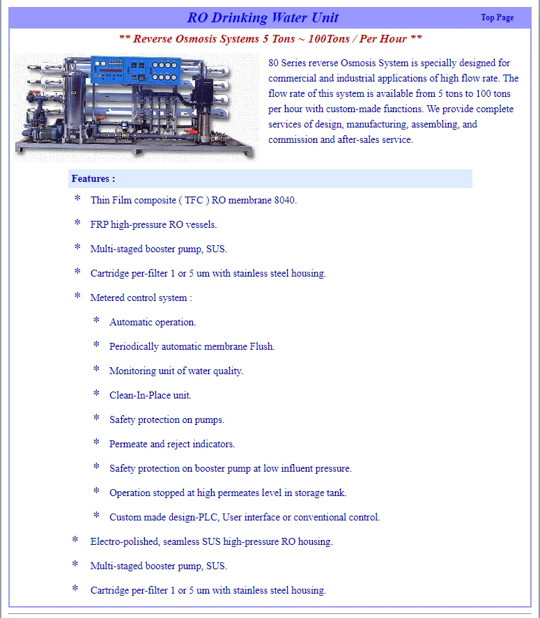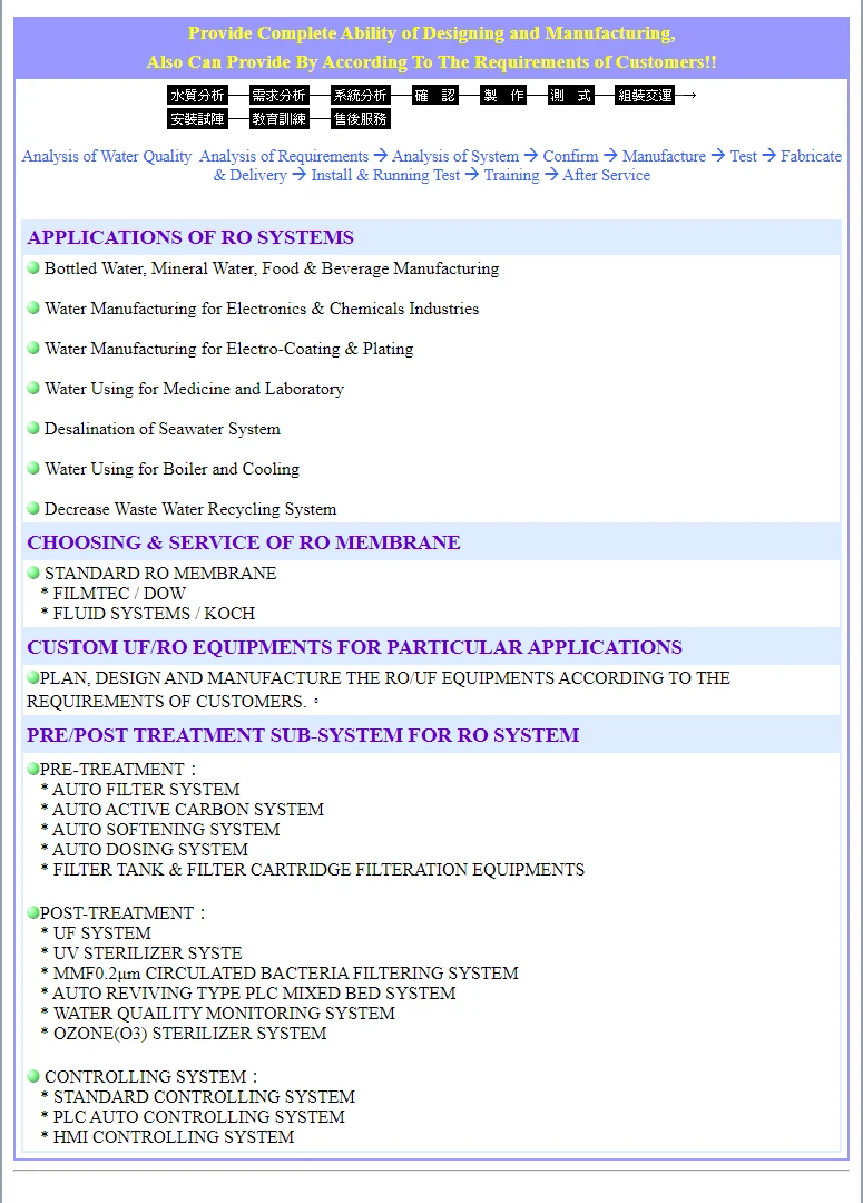 by ion-exchange or RO membranes. Water can be further purified by polisher or EDI membranes to consistently achieve resistivity greater than 17 mega ohms. Incorporated into the systems are bacteria sterilizer, TOC removal, and inert gas tank.