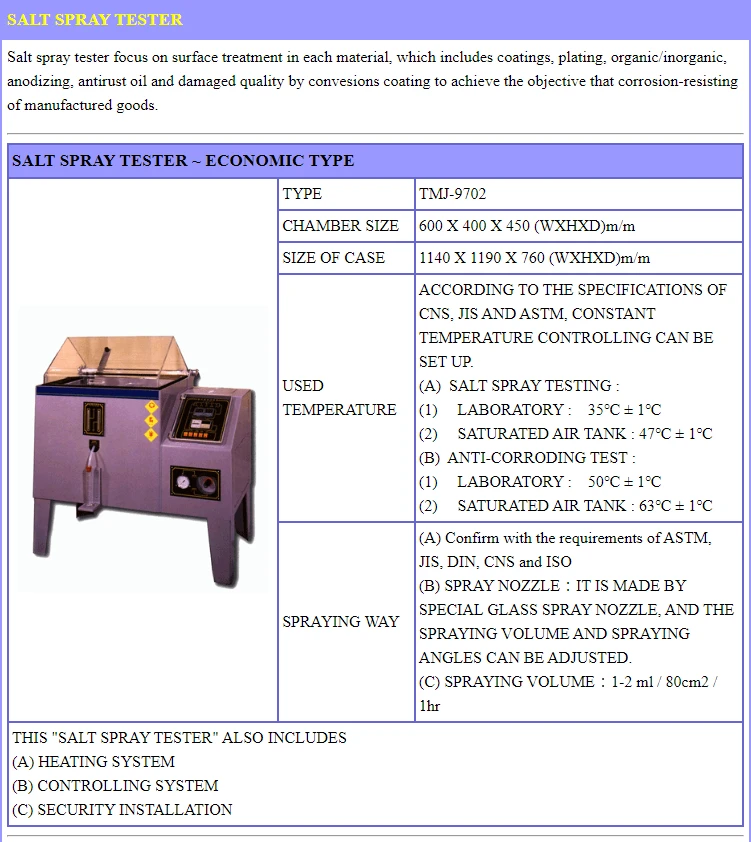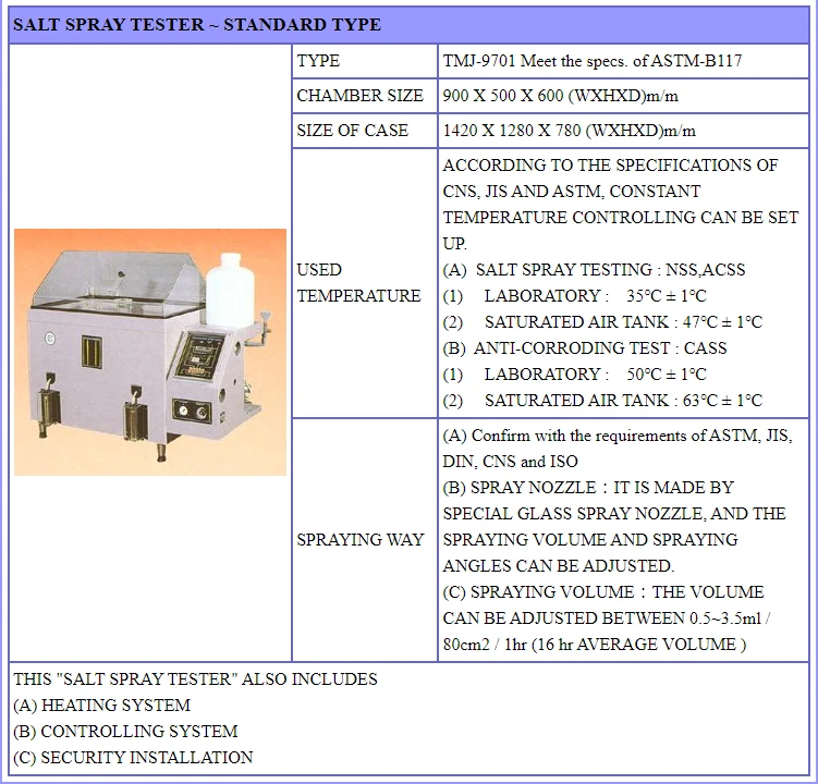 Salt spray tester focus on surface treatment in each material, which includes coatings, plating, organic/inorganic, anodizing, antirust oil and damaged quality by convesions coating to achieve the objective that corrosion-resisting of manufactured goods.